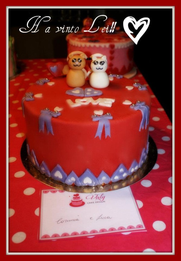 Ecco la torta vincitrice del Torneo di San Valentino Cakes in Love, che ha visto tanti innamorati impegnati nella decorazione di una torta. I vincitori sono Corinna e Luca, che salutiamo! Ringraziamo l’organizzatrice dell’evento, Valy Cake design.