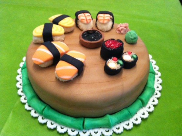 E per gli amanti del sushi… torte sushi decorate in pasta di zucchero con tanto di nigiri, wasabi e salsa di soia!