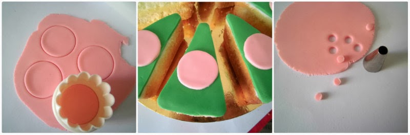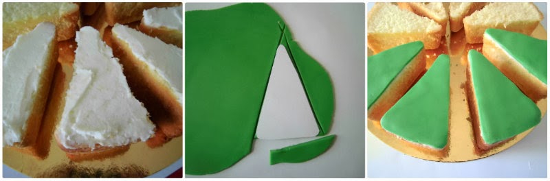 Stendete la pasta di zucchero verde, ritagliate la sagoma della fetta di torta su un cartoncino e utilizzatelo per ritagliare 4 triangoli, che applicherete su 4 fette di torta.