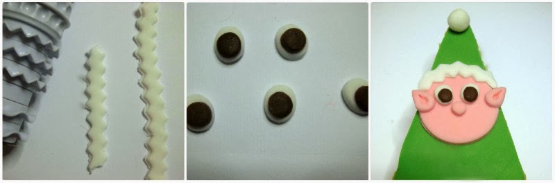 Stendete la pasta di zucchero bianca e ricavate delle striscioline con una rotella dentellata, le userete per bordare il cappello degli elfi.
