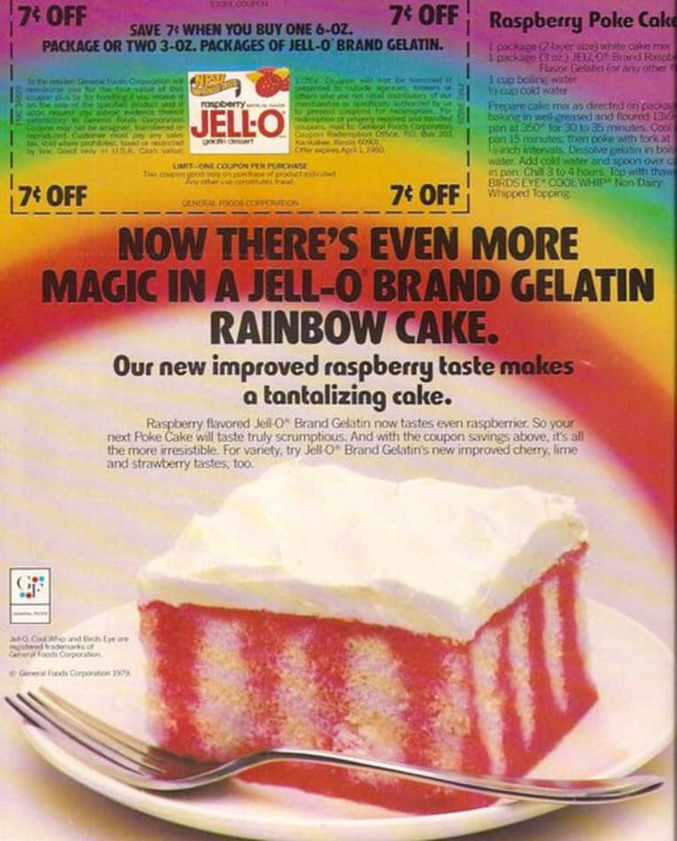 Nella pubblicità della Jell-O bastava forare la superficie (to poke: colpire con uno stecco, forare) con il manico di un cucchiaio e far colare sulla superficie la gelatina colorata e aromatizzata alla ciliegia, al lime o alla fragola. La gelatina riempiva i fori della torta creando una farcitura perfetta e dall’effetto obiettivamente psichedelico.